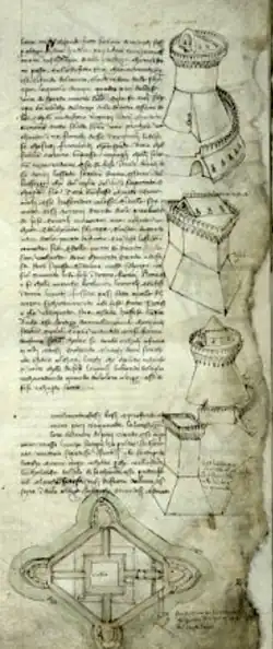 - ↑ Trattato di Archit.a civ. e milit. (Traité d'architecture civile et militaire) vers 1492, conservé à la bibliothèque Laurentienne, publié pour la première fois par le chevalier Cesare Saluzzo. Turin, 1841 (Texte)