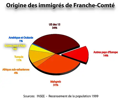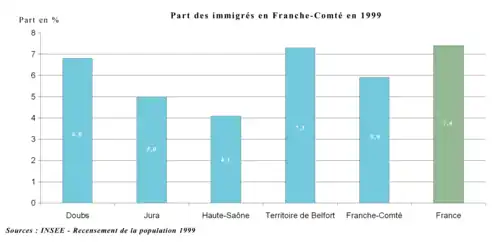 En 1999, la Franche-Comté comptait 65 541 immigrés[32] où 1/3 étaient français par acquisition. 5,9% de la population franc-comtoise est immigrée contre 7,4% au niveau national. Bien que la part des immigrés soit stable depuis 1975 en France métropolitaine, elle a diminué de 1,4 point dans la région. Bien que le Territoire de Belfort soit le département le moins peuplé, il reste néanmoins le seul où la moyenne d'immigrés est comparable à celle de la France. Les immigrés sont surtout présents dans les grandes villes telles Besançon, Belfort et Montbéliard.