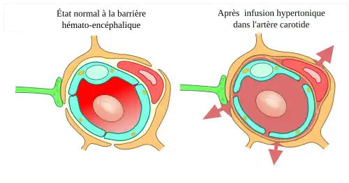 Des solutions hyperosmolaires, par exemple de mannitol ou d'arabinose, sont infusées par l'artère carotide interne. La différence de pression osmotique entre les cellules endothéliales et la solution infusée provoque une perte de liquide dans les cellules endothéliales, et par suite à leur rétrécissement. Ce dernier engendre des forces de traction entre les cellules, ce qui conduit à l'ouverture des jonctions serrées, c'est-à-dire de la barrière hémato-encéphalique[125],[126].