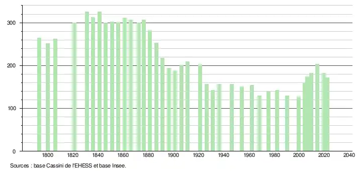 L'évolution du nombre d'habitants est connue à travers les recensements de la population effectués dans la commune depuis 1793. Pour les communes de moins de 10 000 habitants, une enquête de recensement portant sur toute la population est réalisée tous les cinq ans, les populations de référence des années intermédiaires étant quant à elles estimées par interpolation ou extrapolation[26]. Pour la commune, le premier recensement exhaustif entrant dans le cadre du nouveau dispositif a été réalisé en 2004[27].
