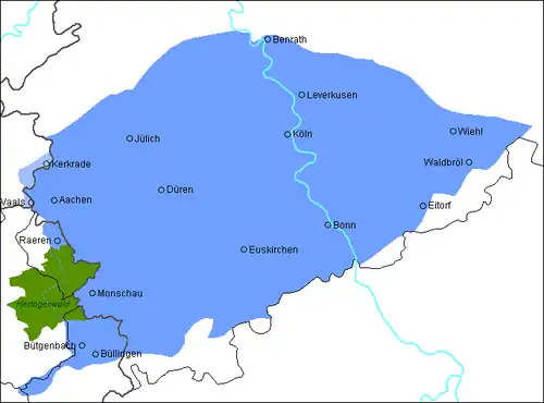 - à l'ouest, elle passe entre Eupen et Aix-la-Chapelle mais a Eynatten, La Calamine, Hauset et Raeren dansl'aire du ripuaire.