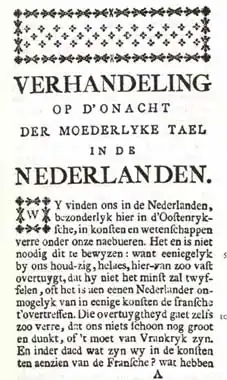 - ↑ Titre original : Verhandeling op d'onacht der moederlyke tael in de Nederlanden.