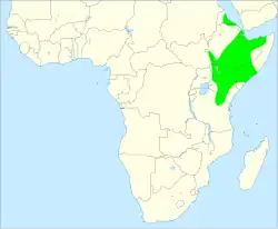 Est de l’Afrique : Érythrée, sud de l’Éthiopie (sauf les Hauts Plateaux), nord et sud de la Somalie, Kenya, nord-est de l’Ouganda, extrême sud-est du Soudan, centre-nord de la Tanzanie.