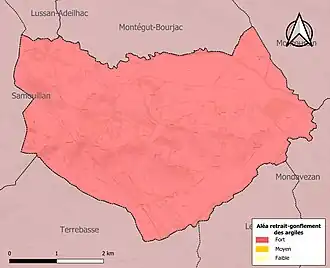 Le retrait-gonflement des sols argileux est susceptible d'engendrer des dommages importants aux bâtiments en cas d’alternance de périodes de sécheresse et de pluie. La totalité de la commune est en aléa moyen ou fort (88,8 % au niveau départemental et 48,5 % au niveau national). Sur les 113 bâtiments dénombrés sur la commune en 2019, 113 sont en aléa moyen ou fort, soit 100 %, à comparer aux 98 % au niveau départemental et 54 % au niveau national. Une cartographie de l'exposition du territoire national au retrait gonflement des sols argileux est disponible sur le site du BRGM[27],[Carte 3].