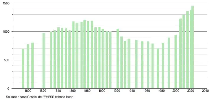 L'évolution du nombre d'habitants est connue à travers les recensements de la population effectués dans la commune depuis 1793. Pour les communes de moins de 10 000 habitants, une enquête de recensement portant sur toute la population est réalisée tous les cinq ans, les populations de référence des années intermédiaires étant quant à elles estimées par interpolation ou extrapolation[26]. Pour la commune, le premier recensement exhaustif entrant dans le cadre du nouveau dispositif a été réalisé en 2005[27].