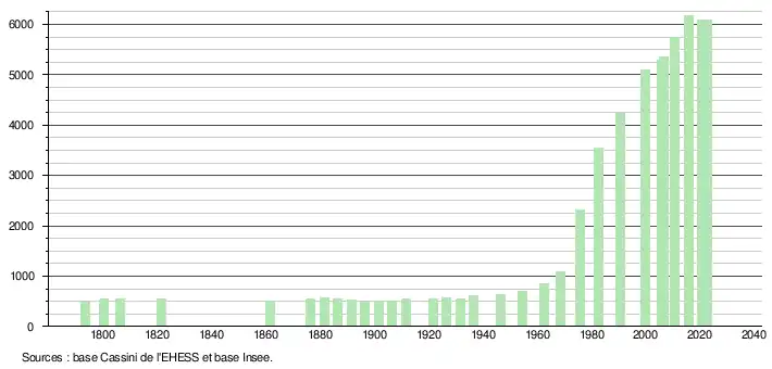 L'évolution du nombre d'habitants est connue à travers les recensements de la population effectués dans la commune depuis 1793. Pour les communes de moins de 10 000 habitants, une enquête de recensement portant sur toute la population est réalisée tous les cinq ans, les populations de référence des années intermédiaires étant quant à elles estimées par interpolation ou extrapolation[27]. Pour la commune, le premier recensement exhaustif entrant dans le cadre du nouveau dispositif a été réalisé en 2005[28].