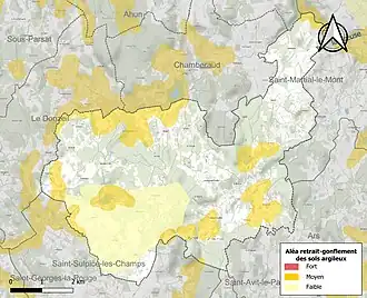 Le retrait-gonflement des sols argileux est susceptible d'engendrer des dommages importants aux bâtiments en cas d’alternance de périodes de sécheresse et de pluie. 18,4 % de la superficie communale est en aléa moyen ou fort (33,6 % au niveau départemental et 48,5 % au niveau national). Sur les 229 bâtiments dénombrés sur la commune en 2019, 27 sont en aléa moyen ou fort, soit 12 %, à comparer aux 25 % au niveau départemental et 54 % au niveau national. Une cartographie de l'exposition du territoire national au retrait gonflement des sols argileux est disponible sur le site du BRGM[16],[Carte 2].
