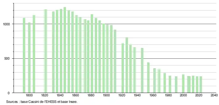 L'évolution du nombre d'habitants est connue à travers les recensements de la population effectués dans la commune depuis 1793. Pour les communes de moins de 10 000 habitants, une enquête de recensement portant sur toute la population est réalisée tous les cinq ans, les populations de référence des années intermédiaires étant quant à elles estimées par interpolation ou extrapolation[22]. Pour la commune, le premier recensement exhaustif entrant dans le cadre du nouveau dispositif a été réalisé en 2007[23].