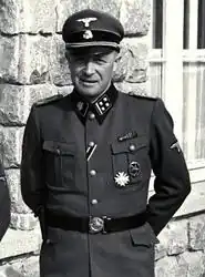 - ↑ Équivalent en France de commandant, mais il s'agit ici d’un grade dans le corps des gardes SS de camps de concentration.