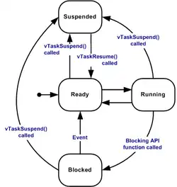 Les tâches sous FreeRTOS peuvent exister sous 5 états : "supprimé", "suspendu", "prêt", "bloqué" ou "en exécution"[18].