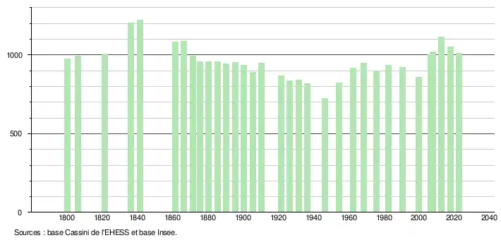 L'évolution du nombre d'habitants est connue à travers les recensements de la population effectués dans la commune depuis 1800. Pour les communes de moins de 10 000 habitants, une enquête de recensement portant sur toute la population est réalisée tous les cinq ans, les populations de référence des années intermédiaires étant quant à elles estimées par interpolation ou extrapolation[19]. Pour la commune, le premier recensement exhaustif entrant dans le cadre du nouveau dispositif a été réalisé en 2007[20].