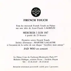 3. Sur le carton d'invitation de la « première soirée French touch » dans la boîte de nuit Le Palace, on lit : « FRENCH TOUCH : Tous les mercredis French touch au Palace sur une idée de Jean-Claude Lagrèze/ MERCREDI 3 JUIN 1987 / à partir de 23 heures ».
