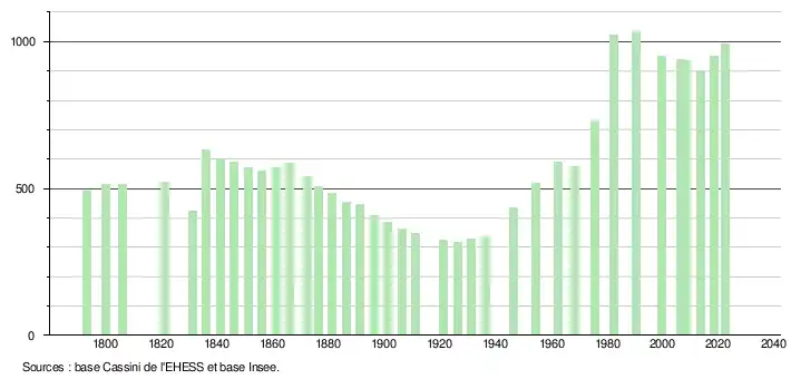 L'évolution du nombre d'habitants est connue à travers les recensements de la population effectués dans la commune depuis 1793. Pour les communes de moins de 10 000 habitants, une enquête de recensement portant sur toute la population est réalisée tous les cinq ans, les populations de référence des années intermédiaires étant quant à elles estimées par interpolation ou extrapolation[21]. Pour la commune, le premier recensement exhaustif entrant dans le cadre du nouveau dispositif a été réalisé en 2008[22].