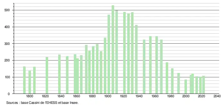 L'évolution du nombre d'habitants est connue à travers les recensements de la population effectués dans la commune depuis 1793. Pour les communes de moins de 10 000 habitants, une enquête de recensement portant sur toute la population est réalisée tous les cinq ans, les populations de référence des années intermédiaires étant quant à elles estimées par interpolation ou extrapolation[16]. Pour la commune, le premier recensement exhaustif entrant dans le cadre du nouveau dispositif a été réalisé en 2008[17].
