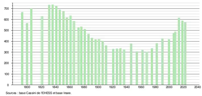 L'évolution du nombre d'habitants est connue à travers les recensements de la population effectués dans la commune depuis 1793. Pour les communes de moins de 10 000 habitants, une enquête de recensement portant sur toute la population est réalisée tous les cinq ans, les populations de référence des années intermédiaires étant quant à elles estimées par interpolation ou extrapolation[27]. Pour la commune, le premier recensement exhaustif entrant dans le cadre du nouveau dispositif a été réalisé en 2008[28].