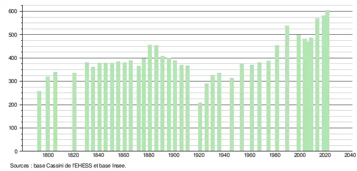 L'évolution du nombre d'habitants est connue à travers les recensements de la population effectués dans la commune depuis 1793. Pour les communes de moins de 10 000 habitants, une enquête de recensement portant sur toute la population est réalisée tous les cinq ans, les populations de référence des années intermédiaires étant quant à elles estimées par interpolation ou extrapolation[35]. Pour la commune, le premier recensement exhaustif entrant dans le cadre du nouveau dispositif a été réalisé en 2004[36].