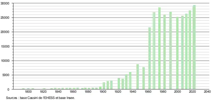 - ↑ Par convention dans Wikipédia, le principe a été retenu de n’afficher dans le tableau des recensements et le graphique, pour les populations de référence postérieures à 1999, que les populations correspondant à une enquête exhaustive de recensement pour les communes de moins de 10 000 habitants, et que les populations des années 2006, 2011, 2016, etc. pour les communes de plus de 10 000 habitants, ainsi que la dernière population de référence publiée par l’Insee pour l'ensemble des communes.