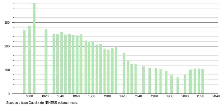 L'évolution du nombre d'habitants est connue à travers les recensements de la population effectués dans la commune depuis 1793. Pour les communes de moins de 10 000 habitants, une enquête de recensement portant sur toute la population est réalisée tous les cinq ans, les populations de référence des années intermédiaires étant quant à elles estimées par interpolation ou extrapolation[28]. Pour la commune, le premier recensement exhaustif entrant dans le cadre du nouveau dispositif a été réalisé en 2007[29].