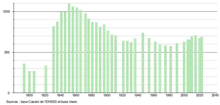 L'évolution du nombre d'habitants est connue à travers les recensements de la population effectués dans la commune depuis 1793. Pour les communes de moins de 10 000 habitants, une enquête de recensement portant sur toute la population est réalisée tous les cinq ans, les populations de référence des années intermédiaires étant quant à elles estimées par interpolation ou extrapolation[30]. Pour la commune, le premier recensement exhaustif entrant dans le cadre du nouveau dispositif a été réalisé en 2004[31].