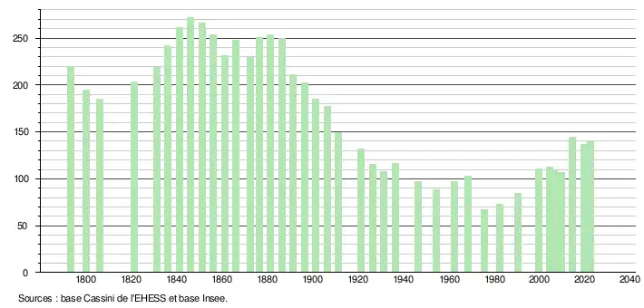 L'évolution du nombre d'habitants est connue à travers les recensements de la population effectués dans la commune depuis 1793. Pour les communes de moins de 10 000 habitants, une enquête de recensement portant sur toute la population est réalisée tous les cinq ans, les populations de référence des années intermédiaires étant quant à elles estimées par interpolation ou extrapolation[37]. Pour la commune, le premier recensement exhaustif entrant dans le cadre du nouveau dispositif a été réalisé en 2004[38].
