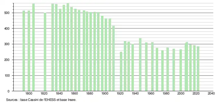 L'évolution du nombre d'habitants est connue à travers les recensements de la population effectués dans la commune depuis 1793. Pour les communes de moins de 10 000 habitants, une enquête de recensement portant sur toute la population est réalisée tous les cinq ans, les populations de référence des années intermédiaires étant quant à elles estimées par interpolation ou extrapolation[23]. Pour la commune, le premier recensement exhaustif entrant dans le cadre du nouveau dispositif a été réalisé en 2007[24].