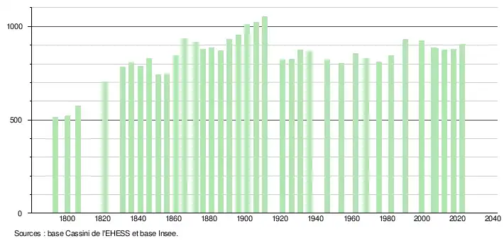 L'évolution du nombre d'habitants est connue à travers les recensements de la population effectués dans la commune depuis 1793. Pour les communes de moins de 10 000 habitants, une enquête de recensement portant sur toute la population est réalisée tous les cinq ans, les populations de référence des années intermédiaires étant quant à elles estimées par interpolation ou extrapolation[21]. Pour la commune, le premier recensement exhaustif entrant dans le cadre du nouveau dispositif a été réalisé en 2007[22].