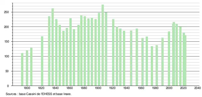 L'évolution du nombre d'habitants est connue à travers les recensements de la population effectués dans la commune depuis 1793. Pour les communes de moins de 10 000 habitants, une enquête de recensement portant sur toute la population est réalisée tous les cinq ans, les populations de référence des années intermédiaires étant quant à elles estimées par interpolation ou extrapolation[26]. Pour la commune, le premier recensement exhaustif entrant dans le cadre du nouveau dispositif a été réalisé en 2005[27].