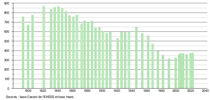 L'évolution du nombre d'habitants est connue à travers les recensements de la population effectués dans la commune depuis 1793. Pour les communes de moins de 10 000 habitants, une enquête de recensement portant sur toute la population est réalisée tous les cinq ans, les populations de référence des années intermédiaires étant quant à elles estimées par interpolation ou extrapolation[39]. Pour la commune, le premier recensement exhaustif entrant dans le cadre du nouveau dispositif a été réalisé en 2004[40].