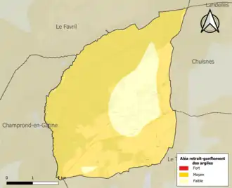 Le retrait-gonflement des sols argileux est susceptible d'engendrer des dommages importants aux bâtiments en cas d’alternance de périodes de sécheresse et de pluie. 81,2 % de la superficie communale est en aléa moyen ou fort (52,8 % au niveau départemental et 48,5 % au niveau national). Sur les 124 bâtiments dénombrés sur la commune en 2019, 38 sont en aléa moyen ou fort, soit 31 %, à comparer aux 70 % au niveau départemental et 54 % au niveau national. Une cartographie de l'exposition du territoire national au retrait gonflement des sols argileux est disponible sur le site du BRGM[17],[Carte 2].