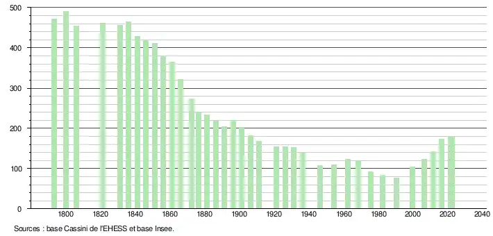 L'évolution du nombre d'habitants est connue à travers les recensements de la population effectués dans la commune depuis 1793. Pour les communes de moins de 10 000 habitants, une enquête de recensement portant sur toute la population est réalisée tous les cinq ans, les populations de référence des années intermédiaires étant quant à elles estimées par interpolation ou extrapolation[28]. Pour la commune, le premier recensement exhaustif entrant dans le cadre du nouveau dispositif a été réalisé en 2006[29].