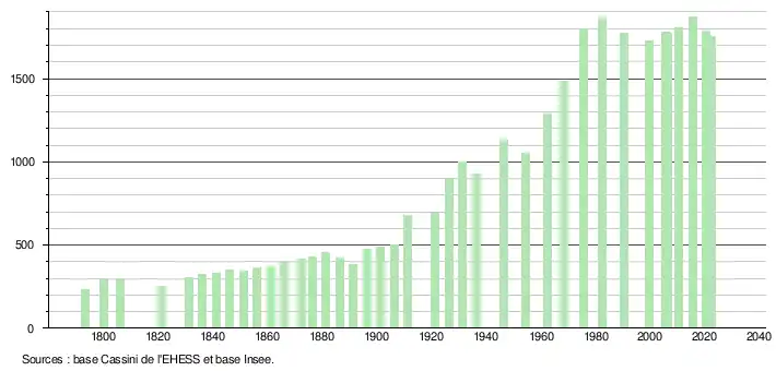 L'évolution du nombre d'habitants est connue à travers les recensements de la population effectués dans la commune depuis 1793. Pour les communes de moins de 10 000 habitants, une enquête de recensement portant sur toute la population est réalisée tous les cinq ans, les populations de référence des années intermédiaires étant quant à elles estimées par interpolation ou extrapolation[34]. Pour la commune, le premier recensement exhaustif entrant dans le cadre du nouveau dispositif a été réalisé en 2005[35].