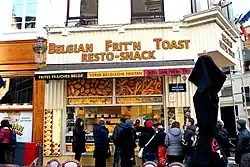 Traditionnellement, les friteries belges, aussi parfois appelées fritures dans la partie francophone de la Belgique, et frietkot ou frituur dans la partie néerlandophone, étaient essentiellement des baraques ou des caravanes mobiles qui restaient à demeure sur la voie publique avec l'accord des autorités. Le terme frietkot / fritkot se répand progressivement au XXIe siècle tant en Flandre qu'à Bruxelles (dont il est originaire). Fritüre, terme français vieilli avec orthographe germanique, se rencontre dans les Cantons de l'Est.