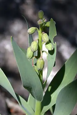 La fritillaire de Perse est une géophyte à bulbe, avec une tige de 50 à 100 cm de hauteur et jusqu’à 120 cm en culture[4],[5]. Elle est généralement constituée d’un bulbe subglobulleux de 4–5 cm de diamètre, formé de 2 à 3 feuilles succulentes[6], d’où émerge une tige cylindrique, de 30 à 60 cm de haut, érigée, vert clair à glauque, garnie de feuilles de 7 à 15 cm de long sur 1 à 3 cm de large, glabres, luisantes, d’un vert gris bleuté ou glauque.