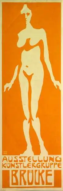 En septembre et en , la première exposition du groupe eut lieu, dédiée au nu féminin, dans la salle d'exposition de K.F.M. Seifert and Co. à Dresde[5]. En transformant des études d'après modèle, Bleyl créa une affiche lithographiée pour la manifestation, imprimée à l'encre orange sur papier blanc. Le poster est dans un format vertical étroit, plus proche de la gravure sur bois japonaise que les impressions conventionnelles de l'époque, et en contraste flagrant avec l'affiche de Otto Gussmann pour la Troisième Exposition Allemande des Arts Appliqués, qui avait ouvert quatre mois auparavant à Dreste[5]. Bleyl écarte des éléments iconographique tels que la couronne, la robe longue pour montrer un simple nu en pied du modèle Isabella au-dessus du texte. La police interdit l'affichage public sur la base du paragraphe 184, la clause sur la pornographie du Code Pénal National, après avoir identifié comme des poils pubiens l'ombre du bas du ventre[5].