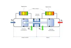 Le système bielle-manivelle reliant les deux pistons est également entraîné par un moteur électrique dont le rôle est de compenser les pertes mécaniques. - Machine de Vuilleumier avec piston de puissance