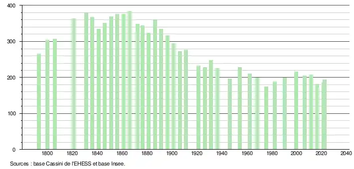 L'évolution du nombre d'habitants est connue à travers les recensements de la population effectués dans la commune depuis 1793. Pour les communes de moins de 10 000 habitants, une enquête de recensement portant sur toute la population est réalisée tous les cinq ans, les populations de référence des années intermédiaires étant quant à elles estimées par interpolation ou extrapolation[24]. Pour la commune, le premier recensement exhaustif entrant dans le cadre du nouveau dispositif a été réalisé en 2006[25].