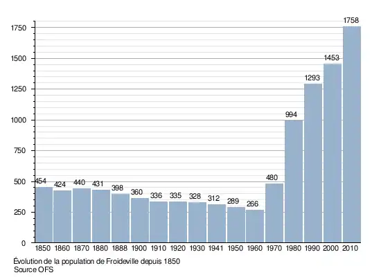 La population de Froideville est de 454 habitants en 1850. Elle baisse progressivement jusqu'à 266 habitants en 1960. Le nombre d'habitants augmente ensuite très fortement, puisqu'il est multiplié par 6,6 en 50 ans. Le graphique suivant résume l'évolution de la population de Froideville entre 1850 et 2010[9] :