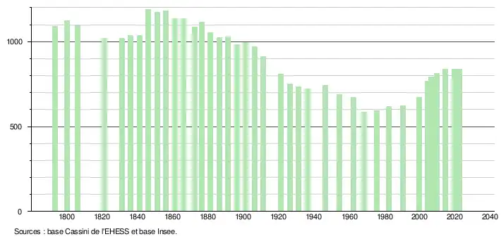 L'évolution du nombre d'habitants est connue à travers les recensements de la population effectués dans la commune depuis 1793. Pour les communes de moins de 10 000 habitants, une enquête de recensement portant sur toute la population est réalisée tous les cinq ans, les populations de référence des années intermédiaires étant quant à elles estimées par interpolation ou extrapolation[22]. Pour la commune, le premier recensement exhaustif entrant dans le cadre du nouveau dispositif a été réalisé en 2004[23].
