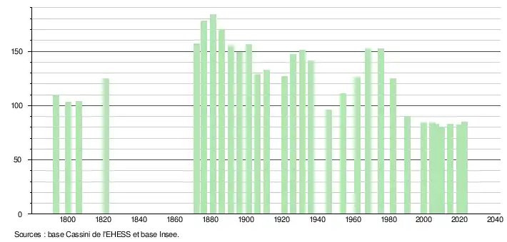 L'évolution du nombre d'habitants est connue à travers les recensements de la population effectués dans la commune depuis 1793. Pour les communes de moins de 10 000 habitants, une enquête de recensement portant sur toute la population est réalisée tous les cinq ans, les populations de référence des années intermédiaires étant quant à elles estimées par interpolation ou extrapolation[17]. Pour la commune, le premier recensement exhaustif entrant dans le cadre du nouveau dispositif a été réalisé en 2004[18].