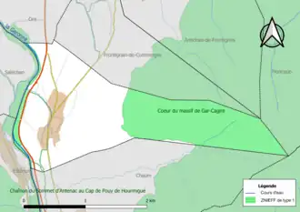 L’inventaire des zones naturelles d'intérêt écologique, faunistique et floristique (ZNIEFF) a pour objectif de réaliser une couverture des zones les plus intéressantes sur le plan écologique, essentiellement dans la perspective d’améliorer la connaissance du patrimoine naturel national et de fournir aux différents décideurs un outil d’aide à la prise en compte de l’environnement dans l’aménagement du territoire. Deux ZNIEFF de type 1[Note 3] sont recensées sur la commune[24] : le « cœur du massif de Gar-Cagire » (6 194 ha), couvrant 15 communes du département[25] et « la Garonne de la frontière franco-espagnole jusqu'à Montréjeau » (469 ha), couvrant 38 communes dont 28 dans la Haute-Garonne et dix dans les Hautes-Pyrénées[26] et deux ZNIEFF de type 2[Note 4],[24] :