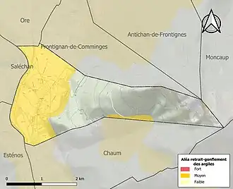 Le retrait-gonflement des sols argileux est susceptible d'engendrer des dommages importants aux bâtiments en cas d’alternance de périodes de sécheresse et de pluie. 44,5 % de la superficie communale est en aléa moyen ou fort (88,8 % au niveau départemental et 48,5 % au niveau national). Sur les 182 bâtiments dénombrés sur la commune en 2019, 182 sont en aléa moyen ou fort, soit 100 %, à comparer aux 98 % au niveau départemental et 54 % au niveau national. Une cartographie de l'exposition du territoire national au retrait gonflement des sols argileux est disponible sur le site du BRGM[35],[Carte 3].