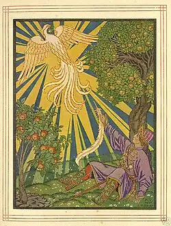 - ↑ Ce début est précisément celui du conte célèbre de L'Oiseau de feu (conte d'Ivan-tsarévitch, de l'oiseau de feu et du loup gris), sauf qu'Ivan capture ici l'oiseau au lieu de ne lui arracher qu'une plume.