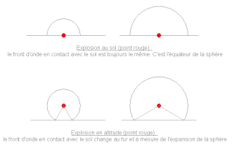 C'est pour cette raison que les explosions des bombes nucléaires d'Hiroshima et Nagasaki ont été déclenchées à quelques centaines de mètres du sol. En effet, si la bombe explose au niveau du sol, le front d'onde qui va avoir des conséquences destructrices n'est formé que de l'équateur de la sphère grandissante. Ainsi, la force de ce front va être rapidement atténuée par les obstacles rencontrés. En revanche, en explosant au-dessus du niveau du sol, le front d'onde qui rencontre le sol n'est jamais le même, il est en permanence renouvelé lors de l'expansion de la sphère, ce qui assure une énergie de destruction maximale.