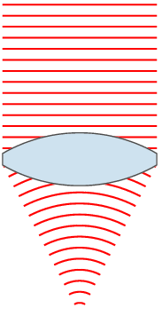 Une lentille peut changer la forme du front d'onde : ici, les plans d'une onde plane deviennent des sphères, caractéristique d'une onde sphérique.