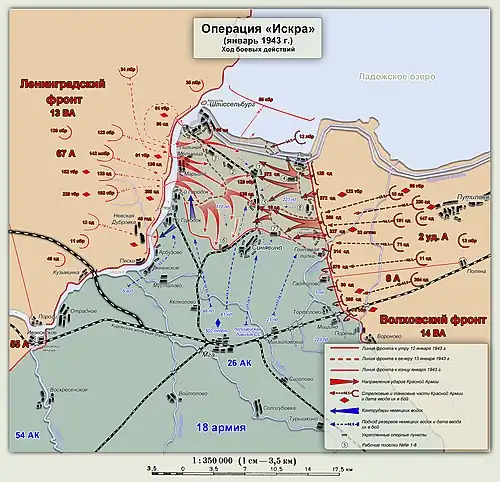 En janvier 1943, lors de l'opération Iskra les forces du front de Léningrad prennent la ville de Chlisselbourg et réduisent le « col de bouteille » en rejoignant les forces du front de Volkhov rétablissant ainsi la communication entre Léningrad et le reste du pays.