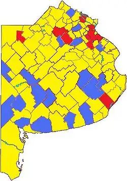 Résultats des élections générales de 2009 dans la province de Buenos Aires. En rouge les partidos gagnés par le Front pour la victoire; en bleu l'Accord civique et social (centre-gauche) et en jaune l'Union Pro (droite).