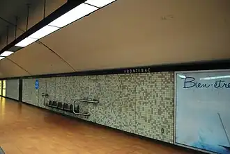 La station ouvrit en décembre 1966 et elle est le terminus de la ligne verte jusqu'en avril 1976. Elle a été baptisée en l'honneur de Louis de Buade, comte de Frontenac, gouverneur de la Nouvelle-France. Construite sur le lit d'une ancienne rivière souterraine, la station souffre de nombreuses infiltration d'eau ce qui crée des salissures sur le plafond, le sol et les murs. Elle ne comporte aucune œuvre d'art. Sur les plans originaux de 1964, la station devait s'appeler Ontario, la rue qui se trouve à la sortie de la station.