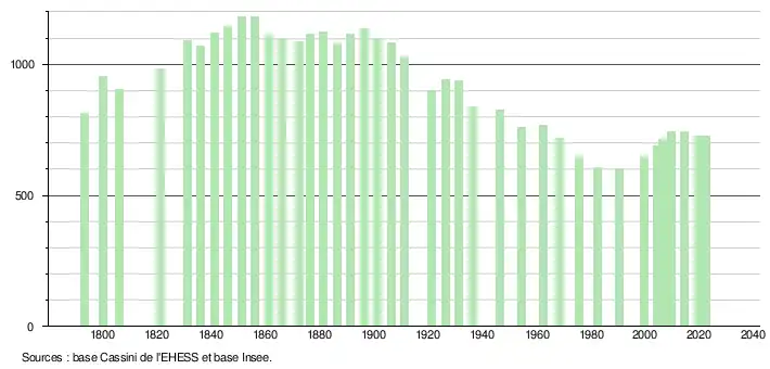 L'évolution du nombre d'habitants est connue à travers les recensements de la population effectués dans la commune depuis 1793. Pour les communes de moins de 10 000 habitants, une enquête de recensement portant sur toute la population est réalisée tous les cinq ans, les populations de référence des années intermédiaires étant quant à elles estimées par interpolation ou extrapolation[18]. Pour la commune, le premier recensement exhaustif entrant dans le cadre du nouveau dispositif a été réalisé en 2004[19].
