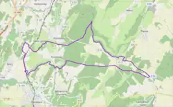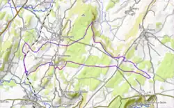 - ↑ Voir la carte topographique ci-dessus, qui donne les courbes de niveau. Distance (approximative) d'après cartographie Google.