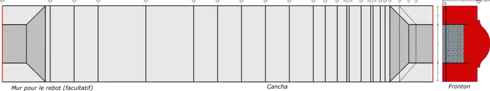 - la cancha (surface jouable au sol de 36 m de long pour 9,5 m de large) ;
